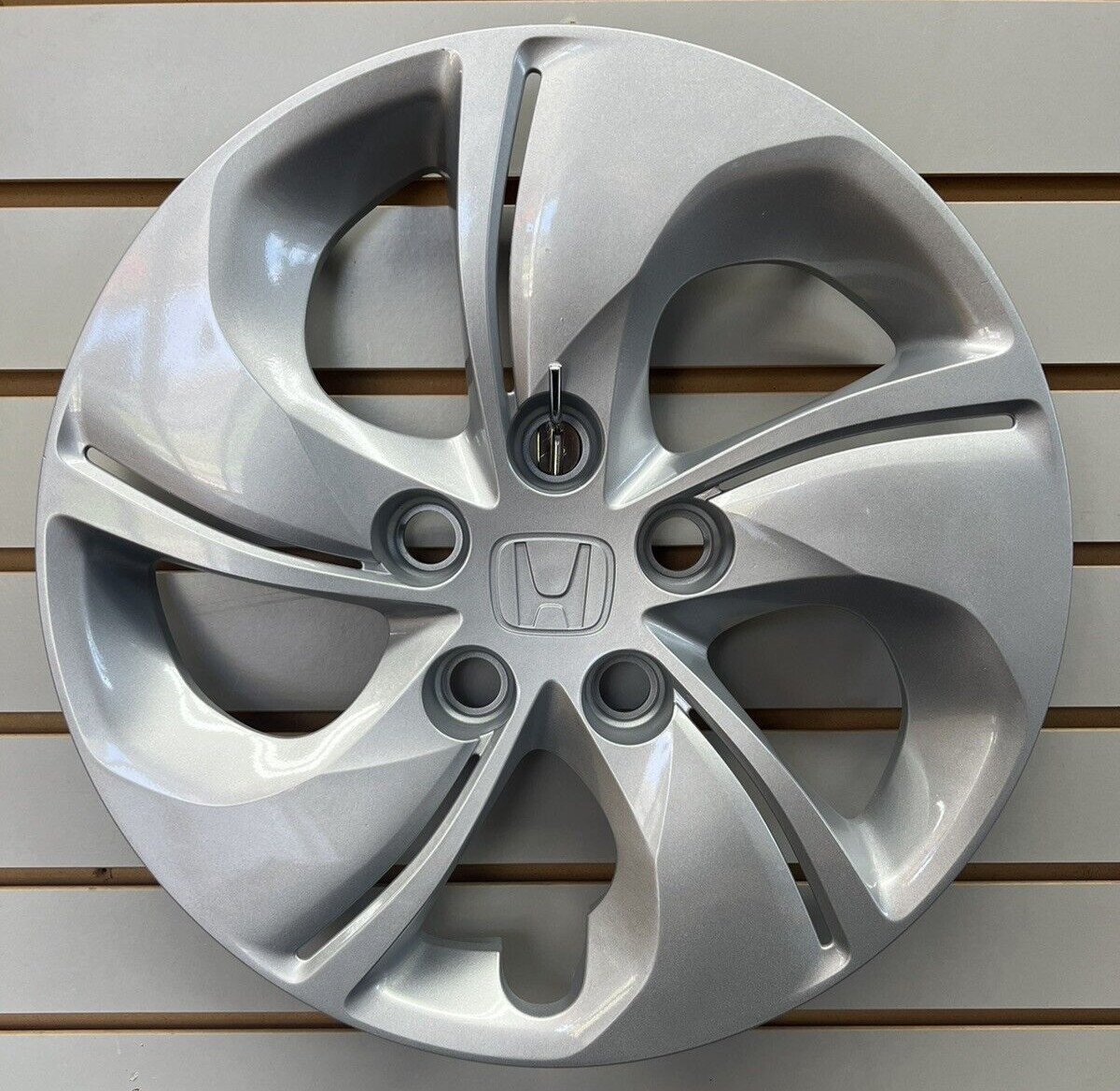 1 factory original Honda wheelcover for -. The price is for each (1) wheelcover. CIVIC 13 (15", 5 spoke), twisted spoke. CIVIC 14-15 15" (5 spoke), twisted spoke. Finish: painted silver plastic. Condition: Like New, professionally repainted/refinished.