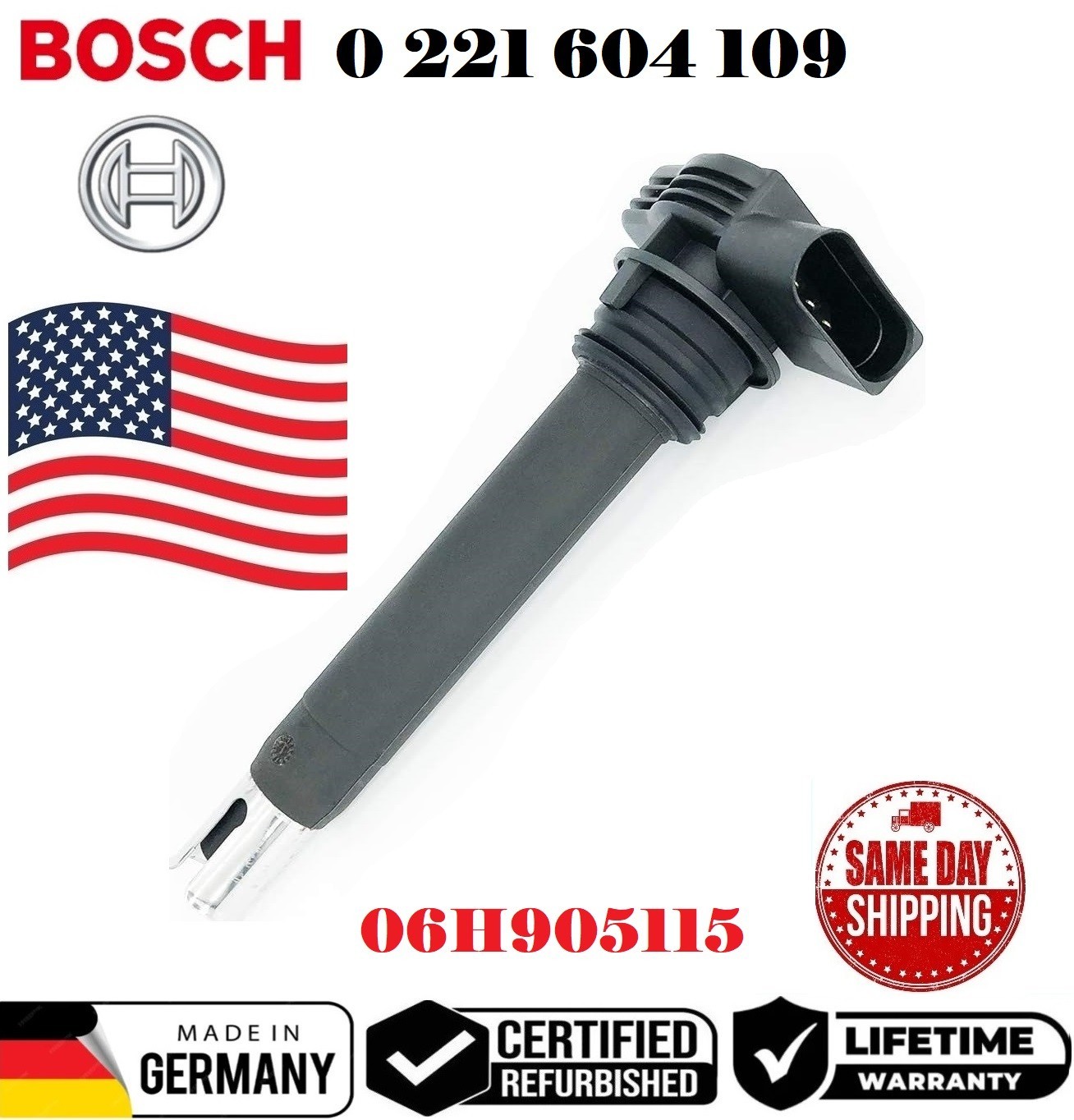 Part Number 0221604115 is a remanufactured Bosch ignition coil for the Audi 200