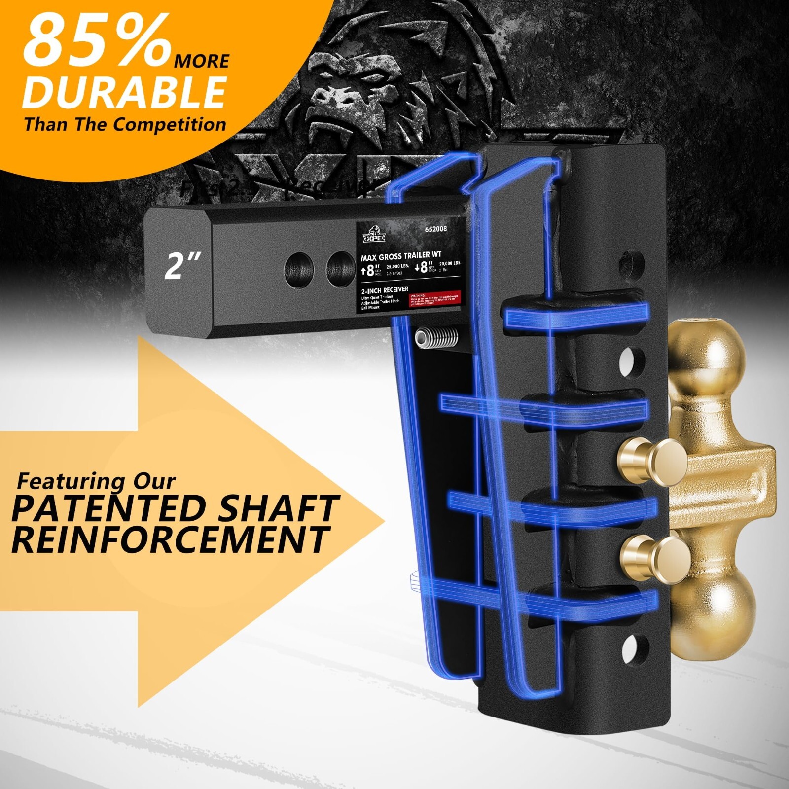 Adjustable Steel Tailer ShankHitch Ball ( 2" And 2-5/16"). Ball Size: 2" and 2-5/16". Loading capacity: 2" Ball-20,000 lbs; 2-5/16" Ball -25,000 lbs. 1 Anti-theft Pins Locks With 2 Keys.