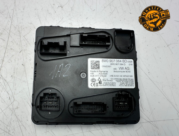 The product is an OEM Body Comfort Control Module (BCM) for Audi vehicles from 2011-2018, including models such as A6, A7, A8, A8L, S6, S7, and S8. This module has a maximum amperage of 8A and is manufactured in Germany. It is designed to be placed on the rear of the vehicle and carries various part numbers for specific Audi models.