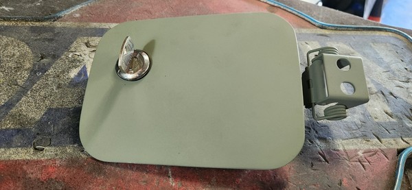 A key locking fuel door for an earty 240z. The hinge articlutes the door like it is supposed to and the lock turns freely.