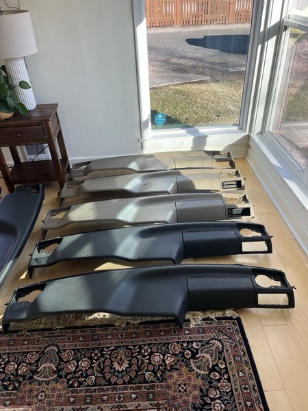Full matched set of burl walnut dashboard and console trim from 850R / 850 T-5R. The wood on this set is 100% perfect. Zero cracks anywhere. All mounts for the glovebox door and kick panels are intact.