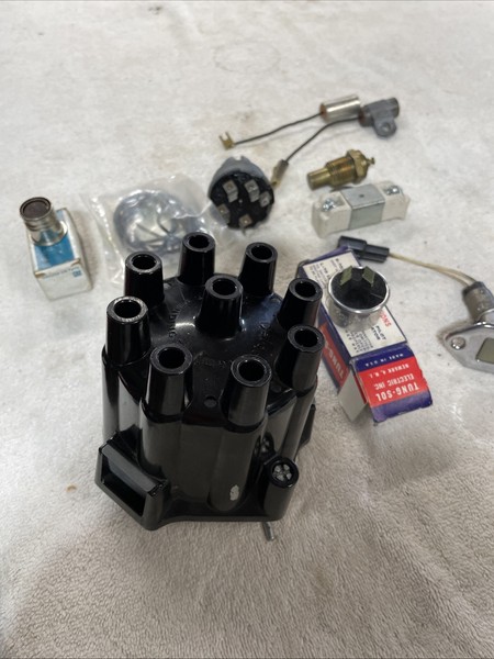 It’s a used dual window cap which is in great shape along with some other electrical items. Some distributor pigtail wires, ign resistor, ign switch, etc.