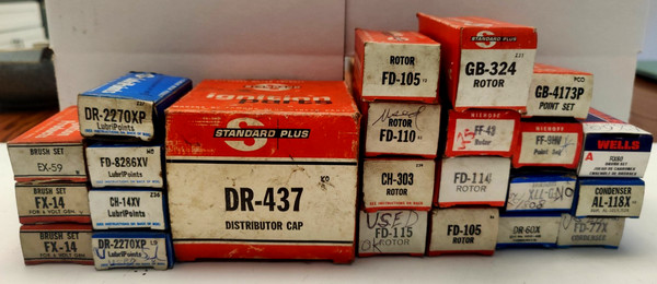 Large Lot Of 24 Ignition Parts Distributor Cap,Points,Rotors,Condensers New&Used. Condition is Used. Shipped with USPS Ground Advantage.