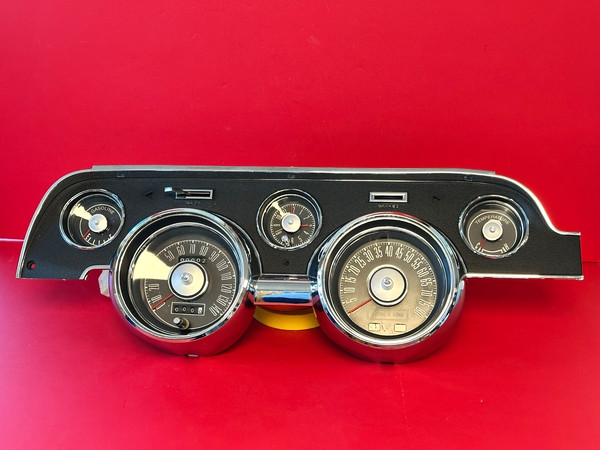 Updated quartz clock, gasoline and temperature gauges are installed. TACH dash wiring harness allows for interface to under dash harness. 1967 Mustang Reconditioned Standard Gauge Cluster. Our show quality work has won awards going back to 1980.