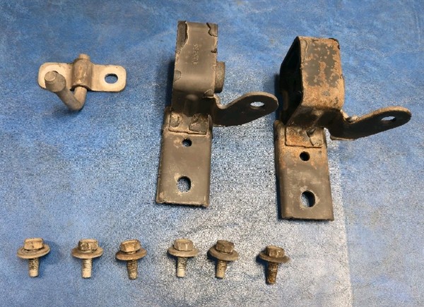 ORIGINAL SET OFF OF A 1968 FORD PICKUP I BELIEVE. SHOULD FIT MANY OTHER YEARS AND MODELS. FLEXIBLE MATERIAL HAS SOME CRACKS BUT IS STILL STRONG. BRACKETS HAD SOME LIGHT SURFACE RUST SO WE PUT A COAT OF BLACK RUST REFORMER ON THEM. AS PICTURED, AS IS. COMES WITH ORIGINAL (I THINK) BOLTS, NUTS, AND WASHER.