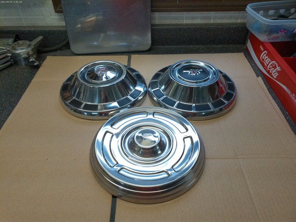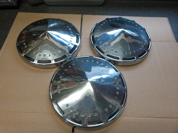 this is for a group of 3 different amc-rambler-10"inch dog dish style wheel center caps--caps have some dings and scratches--1 cap has 2 holes on the side of the cap--some of the painted areas are thin or missing--caps are shown to fit 1960's amc-rambler models