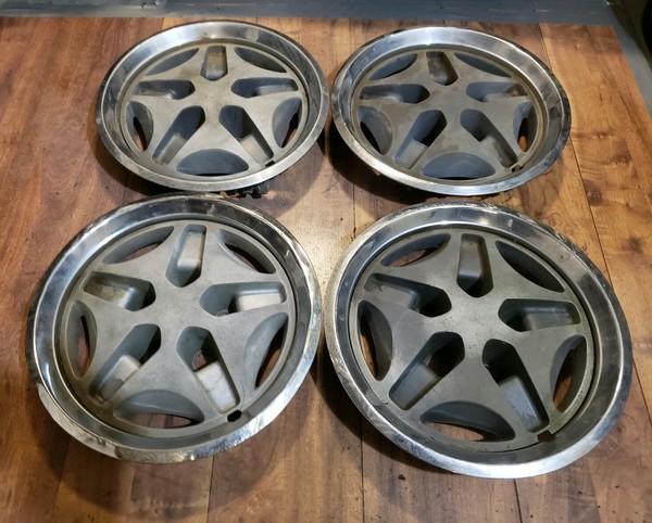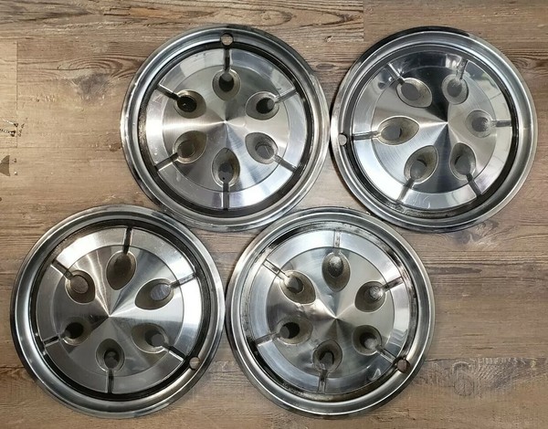 used wheel covers. used. In fair usable condition. see photos. fits most amc cars 72 73 74 75. all have slight scuffs and or a few extremely light dings. over all very good used wheel covers. no tool marks.not pefect but definitely usable