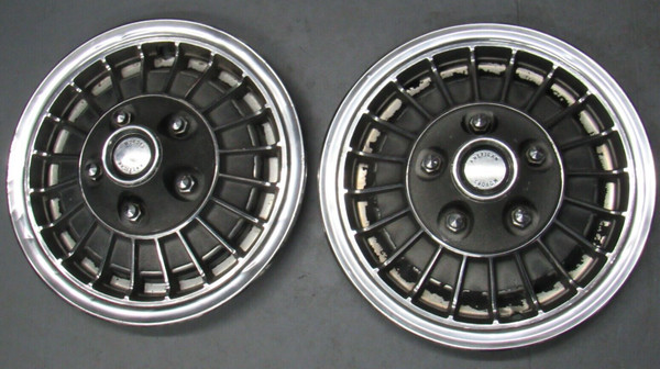 The original painted finish has faded considerably on the spokes but the black areas have held up a little better. They were removed from a running, driving vehicle just as you see them now and still snapped on as intended.