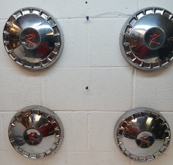 this is for a group of 3 different amc-rambler-10"inch dog dish style wheel center caps--caps have some dings and scratches--1 cap has 2 holes on the side of the cap--some of the painted areas are thin or missing--caps are shown to fit 1960's amc-rambler models