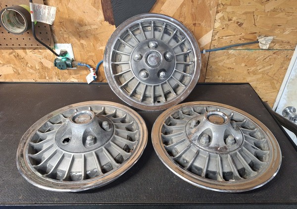 Listing is for three hubcaps. All have wear. Two of them are missing a lug. See photos for best description. Free shipping to the lower 48 states.