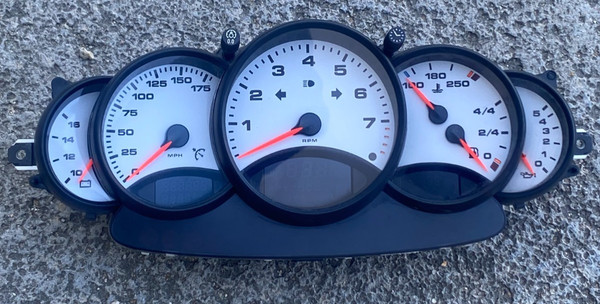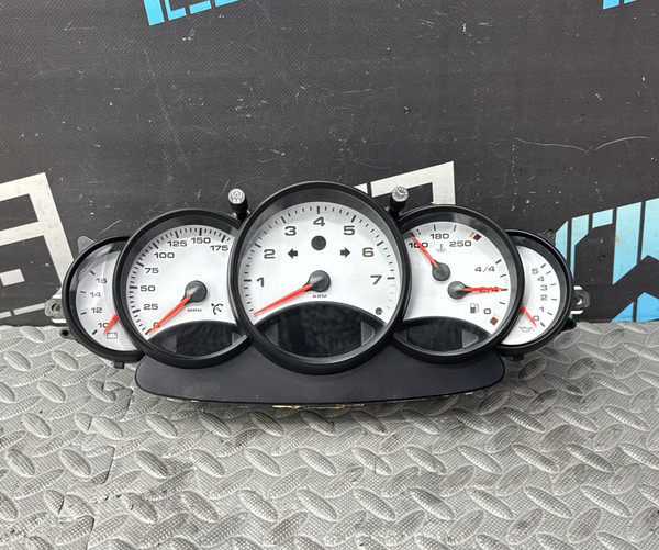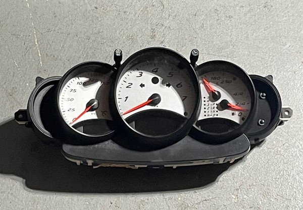 1997 - 1999 OEM Porsche 986 Boxster instrument cluster with silver gauges from a Tiptronic car. Part number 986-641-104-01. Currently showing 156,483 miles on the odometer. Some scuffs and wear on the gauge face covers. Removed from a 1999 Boxster.