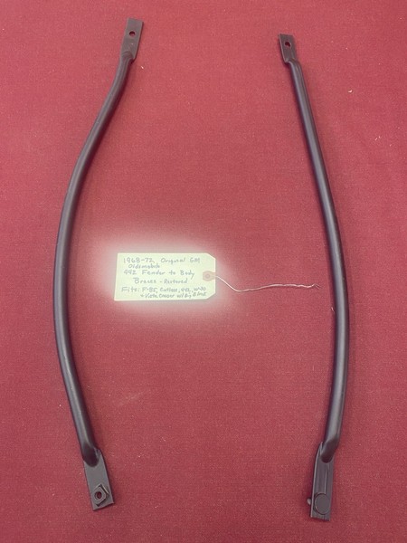 This is a nicely restored pair of 1968-1972 original GM Oldsmobile 442 fender to body braces. These would be correct for F-85, Cutlass, 442, W-30, SX, and Vista Cruiser models with a big block engine. Braces were bead blasted to bare metal, primed, and recoated in Eastwood's Under Hood Black. Braces are in excellent condition.