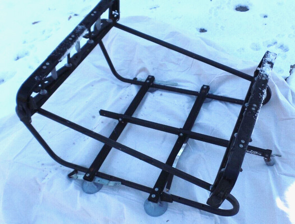 This is a vintage ski rack that has been exposed to the weather. It shows signs of rust, scratches, and soiling. The rubber parts appear to be in good condition and not deteriorated. The unit is complete. The mounting and vehicle this item fits on are unknown, but it was placed on a trunk area, and skis were angled over the roof of the car. The company is no longer in business for parts or repair. No keys for locks. The unit will be broken down to lower shipping costs.