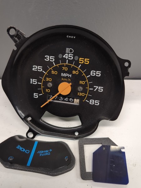 83-87 style Chevy GMC Truck Instrument Cluster Speedo Speedometer, fits other years but gauge housing may need to be modified and the 73-80 gauges go higher (100mph). Works great. Excellent shape, near mint. Has port for speed sensor. Comes exactly as pictured nothing else included.