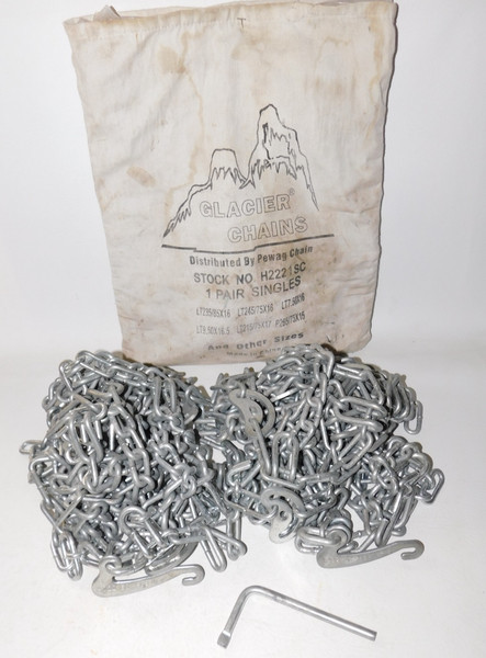 All tire sizes for 2221SC chains per Glacier Chain/Pewag's website Includes cam tool. Used but solid and ready to go!