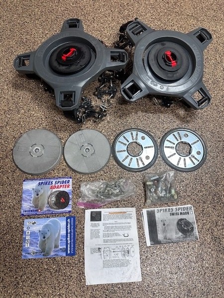 • Size: L167. This system is size-specific (L167). Spikes-Spider snow and ice tire traction device kit (PAIR), Swiss-made and TÜV/GS certified. • (2) Spikes-Spider traction units (pair). No cracks or broken arms observed.