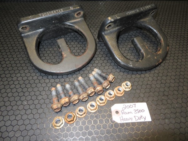 Up for sale is an OEM pair of Front Heavy Duty Tow Hooks from a 2007 Dodge Ram 3500HD. This set is in good condition. The included mounting hardware is also in good shape. If used again they can leak.