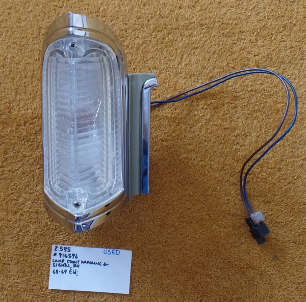 1968-1969 Cadillac Eldorado models. This is a very nice used RH Parking and Turn Signal Lamp Assembly for the following Cadillac models Original GM part number 916596. This a very nice, clean lamp.