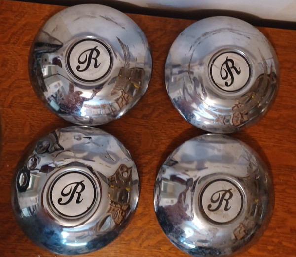 4 Automobile Center Hub Cap with R in Middle 7 1/2" Rolls Royce/Rambler/?